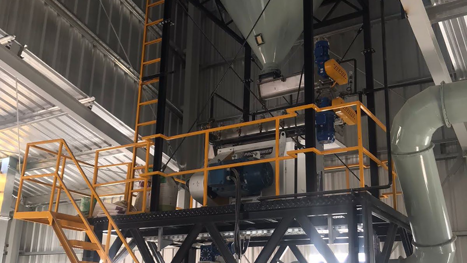 Planta de alimento balanceado en Harinas y Pellets, modelo PFCN 5.000 Automática con sector de medios ingredientes. Opción de quebrado de pellets (para Avicultura). Recepción de materias primas y silos de acopio de maíz y subproductos, además de expedición de alimento terminado a granel.